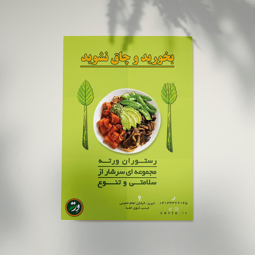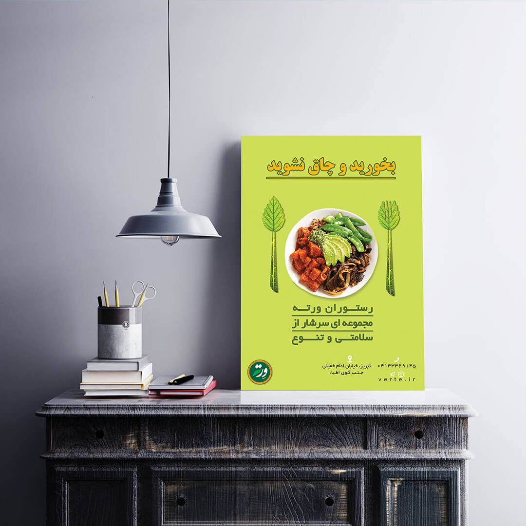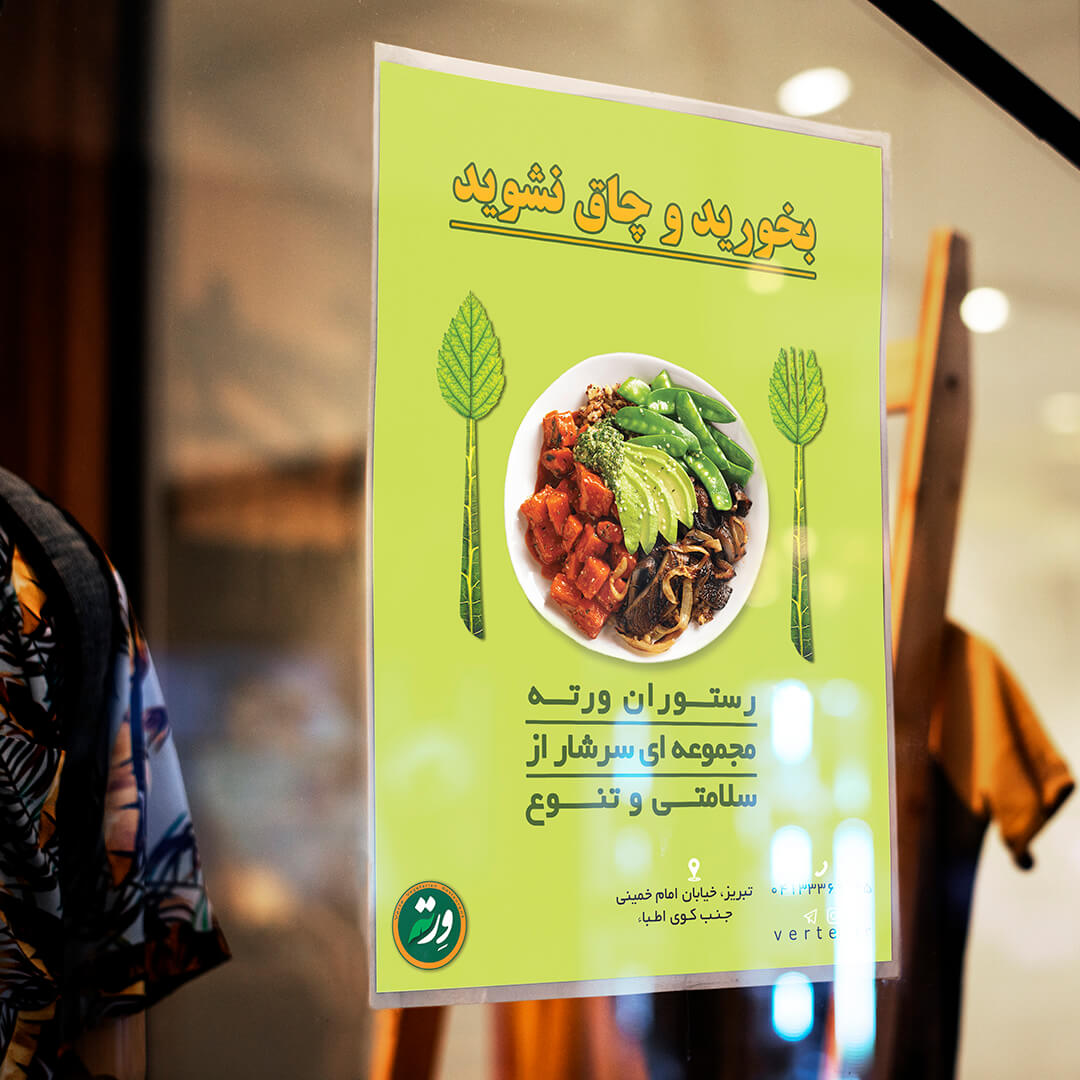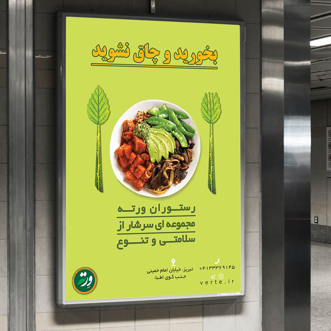 اولین و قطعی ترین قسمتی که باید مطالعه کنید، شناخت مخاطب و شناخت دقیق محصول است.ما به شما کمک خواهیم کرد تا بتوانید در این امر مهم یعنی دیده شدن همواره موفق باشید.رستوران ورته با کمک همکاران ما در تیم نگاه انتخاب جسورانه در امر تبلیغات را داشته و شعاری در پوستر جای داده که ذهن هر فرد گیاه خوار را به سمت خود میکشاند.